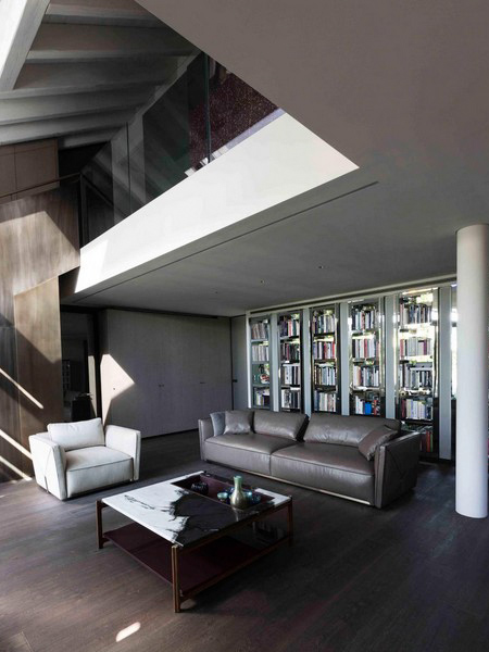Архитектурным центром просторной двухуровневой гостиной является несущая стена, оснащенная модулями книжного шкафа в зеркальной отделке Speyer – культового предмета коллекции фабрики. Он сочетается с декоративными световыми элементами и внушительных размеров лестницей, искусно скрывающей обувной стеллаж и кладовку.