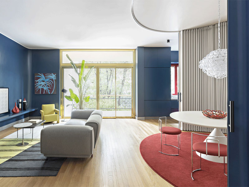 По центру гостиной – необычная каркасная система с раздвижным занавесом. За тканевой перегородкой скрыта тайная комната – столовая. Здесь главный герой – стол Clay от итальянской фабрики Desalto. Модель выпущена по дизайну Марка Крузина и представляет собой оригинальную геометрическую скульптуру, где объединены красота и точные пропорции. Конусовидное основание сужается кверху и острым концом прочно удерживает круглую по форме столешницу. Предмет впервые представлен на iSaloni в 2015 г. и за годы своего существования стал настоящей классикой современности.