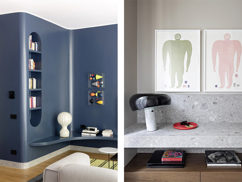 Рельефные панели – не просто декор стен. Это дверцы встроенного шкафа и входная дверь в детскую. Здесь находим табурет Sella по дизайну Акилле и Пьера Джакомо Кастильони (1957 г.) и столик Servomuto по дизайну Акилле Кастильони (1974 г.), все – Zanotta. Рядом – стилизованная прикроватная тумбочка Componibili от Kartell.