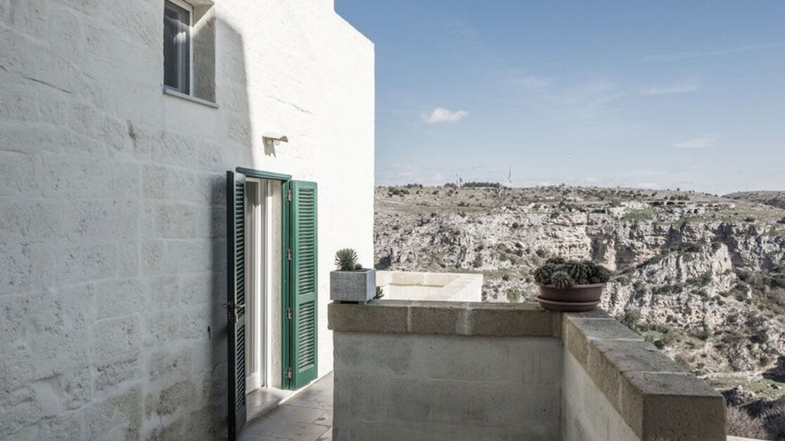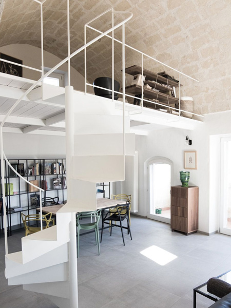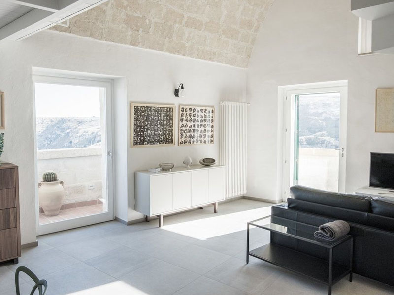 Тонкая винтовая лестница выполнена на заказ из кованого железа и ведет на второй этаж, где расположены небольшая спальня, ванная и мезонин с великолепным видом. По признанию всех, кому однажды довелось посетить Сасси ди Матера, именно этот завораживающий вид способен растопить сердца даже лишенных излишней сентиментальности людей, которые останутся навсегда поражены аскетичной и простой душой района.