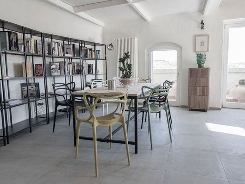 Стулья Kartell Ghost в прозрачном пластике словно растворяются в интерьере, выдвигая на первый план оригинальные грубые фактуры.