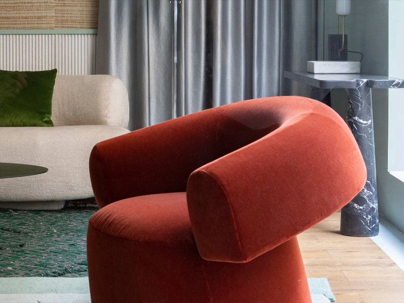 Еще один яркий акцент – кресло Getlucky с основанием в виде скошенного цилиндра. Аккуратный полукруг спинки красиво огибает круглое сиденье. Единственным украшением сдержанного дизайна становится выразительная декоративная строчка, формирующая правильную горизонталь на спинке.