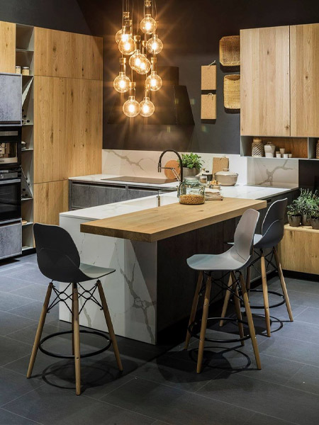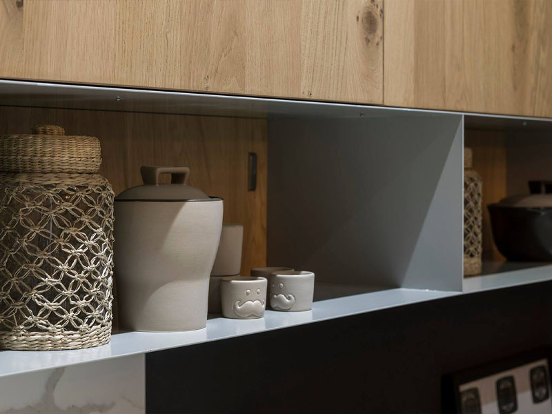 Отличительным признаком является сочетание традиционных материалов (таких, как массив дуба для фасадов, кварц Soul Calacatta для кухонного острова) и современных фактур (в данном случае ламинат с эффектом цемента и поверхности Soft-Touch).