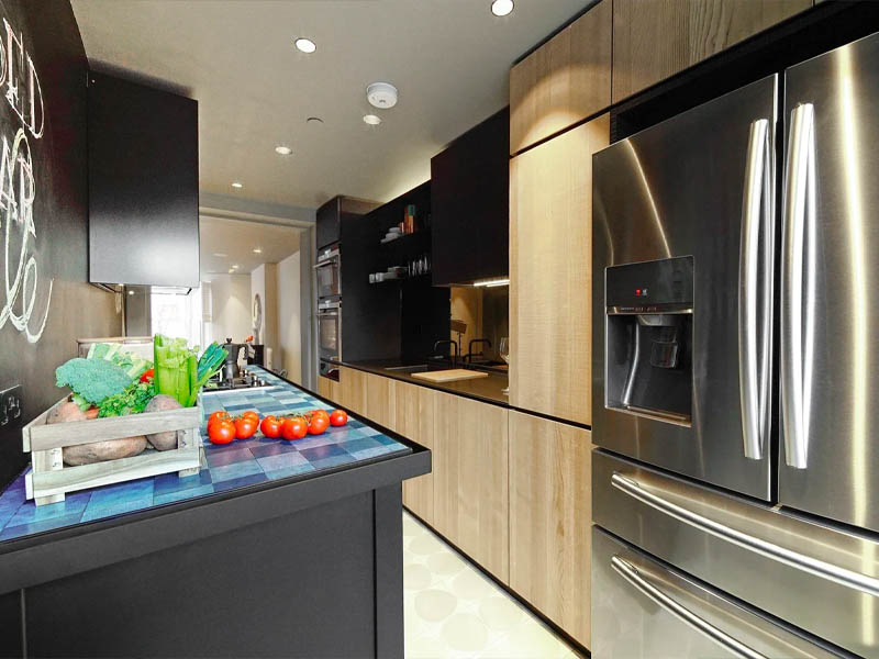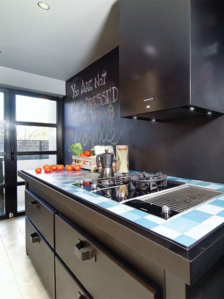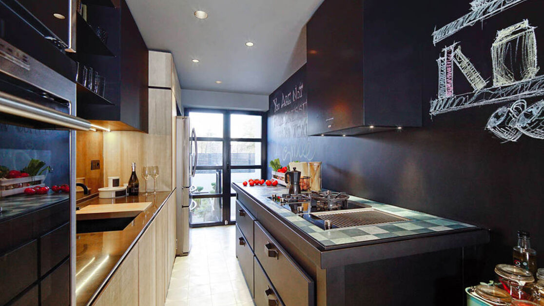 В каждом из трех апартаментов видим кухни итальянского бренда Minacciolo – уникальный микс коллекций Minà и Natural Skin. На первом этаже черный остров Minà со столешницей Cocciopesto, выложенной плиткой. Дополняет композицию кухня Natural Skin, изготовленная из стали и термообработанной древесины. Техничное и функциональное, но одновременно артистичное и теплое пространство стало результатом работы итальянских мастеров.