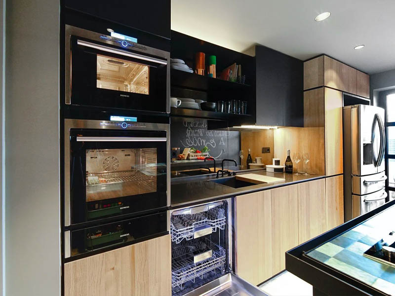 Главная героиня второго и третьего этажей – снова модель Natural Skin, с отделкой в дубе для основания и колонн, а также Fenix-отделкой острова. Пространство продумано до мелочей, здесь каждый компонент тщательно отобран и скомпонован, чтобы довести кулинарное мастерство хозяев до профессиональных высот.