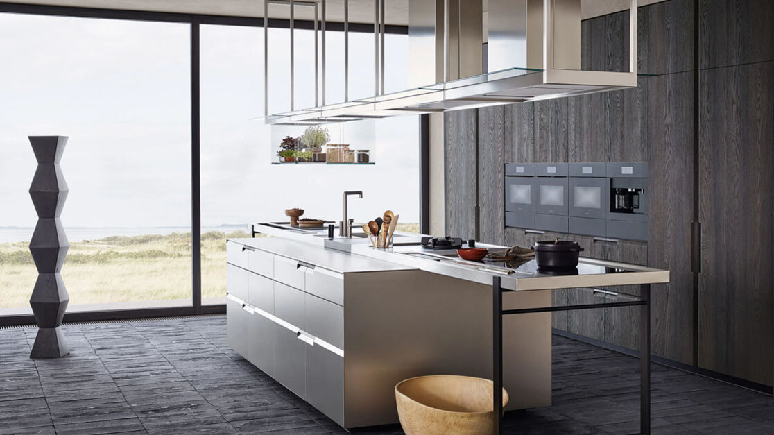 Продуманные аксессуары упрощают быт кулинаров. Среди них – инновационная «парящая» рабочая поверхность на ножках Minus или новая система вытяжек Infinity со встроенной системой освещения, которая дополнена стеклянными подвесными модулями-полками.