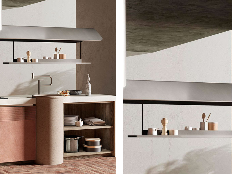 Разъединенные элементы и обширные открытые пространства для хранения позволяют создать кухню, которая выходит далеко за рамки модульной структуры и позволяет неформальные композиции, характерные для итальянских кухонь прошлого столетия.