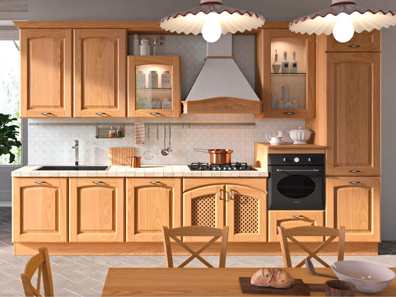 На первый план выходит красота натурального дерева: на всех фасадах шкафчиков и полок видна яркая природная фактура, которая никогда не выйдет из моды. Дверцы украшены филенками и декоративными решетками.
