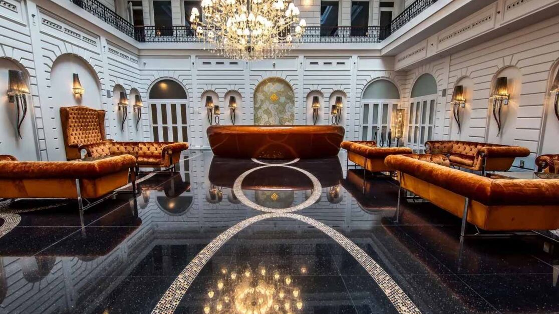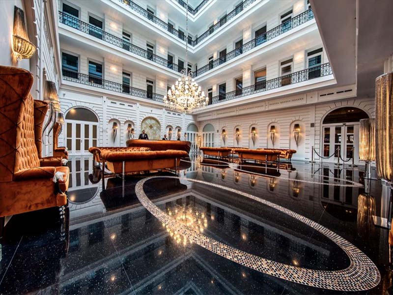 Автор проекта – архитектор Vörös Virág – спроектировал лобби до мельчайших деталей, учитывая специфику и историю здания, а также потребности постоянных клиентов. Для меблировки выбраны интерьерные новинки премиум-класса от итальянского бренда Visionnaire. Роскошные диваны Chester Dudley спроектированы эксклюзивно для Visionnaire дизайнерским дуэтом Роберто Тапиназзи и Маурицио Манцони. Они обиты бархатом медного цвета с металлическим отливом и сгруппированы по два. Благодаря замкнутой форме предметы создают в зале отеля полуприватные зоны, которые идеально подходят для деловых бесед или дружеских встреч. Диваны идеально гармонируют с объемной медной стойкой регистрации. Глянцевый пол холодного темного оттенка эффектно контрастирует с Chester Dudley, а расположенные в арках по периметру зала бра подсвечивают мягкую мебель, расставляя акценты в интерьере отеля.