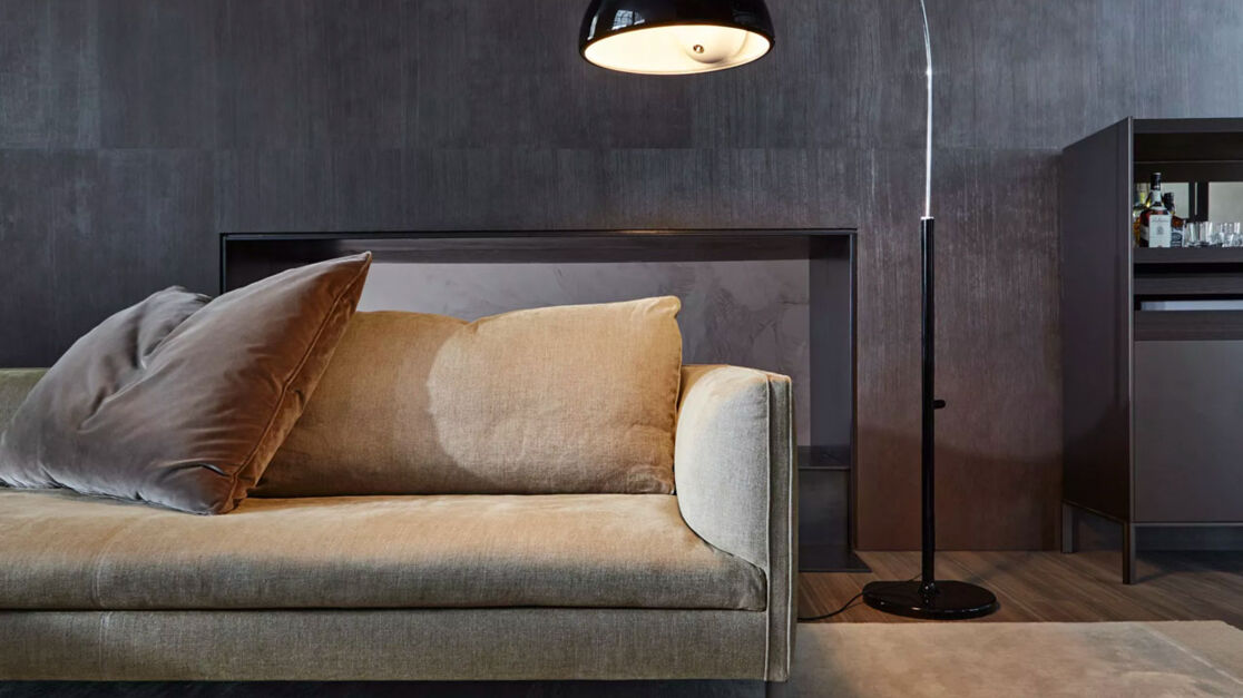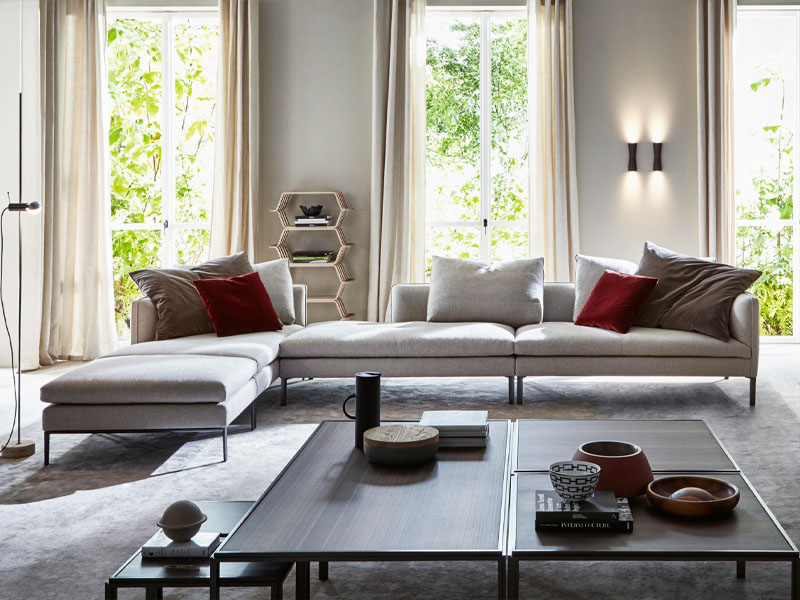 1. Диван Molteni&C Paul с невысокой прямой спинкой и прямыми подлокотниками на одном уровне со спинкой. Прямые ножки, на которых приподнята модель, придают изделию легкости и изящности, а лаконичный силуэт идеально сочетается со строгостью современного интерьера. Размер 275х120 см.