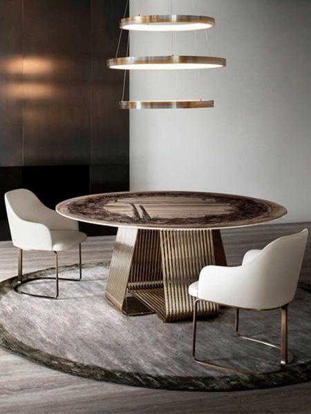 Философия марки базируется на спокойной элегантности и стоит за каждым продуктом Rugiano: его изысканной отделкой, вниманием к мельчайшим деталям, тонкостью ручной работы, использованием новых материалов и творческим переосмыслением традиционных мебельных технологий. Она угадывается в плавных чистых формах мрамора, элегантных бронзовых основаниях, ручной росписи и серебрении столешниц.