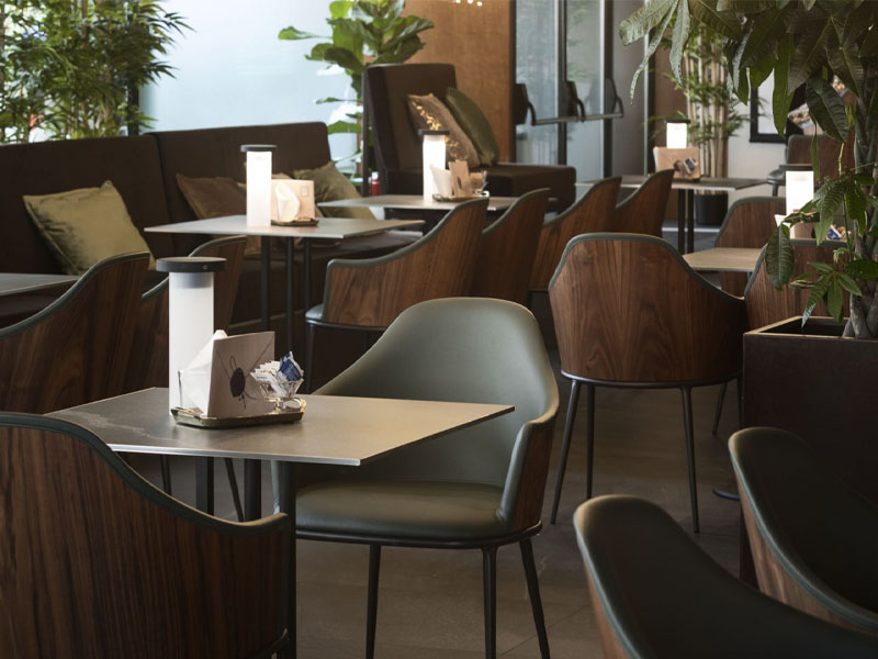 Большие внутренние залы освещены свисающими с потолка лампочками и обставлены креслами из коллекции Lea. Сиденья выполнены в сочетании отделок: искусственная кожа соснового цвета и дерево. Они отлично гармонируют с яркой обстановкой, характеризующейся высокими потолками и большими окнами.