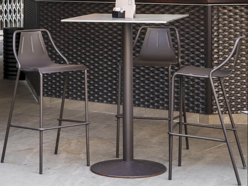 Стулья Ola из темного металла придают помещению элегантность. Они окружают наружную стойку и превращают коктейльный час в момент веселья во имя мягкого дизайна Midj.