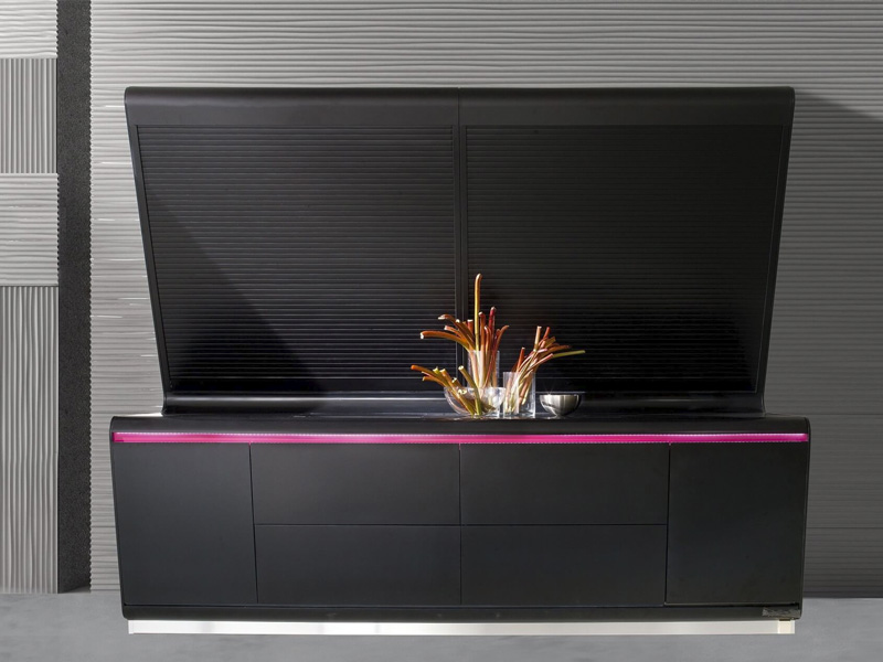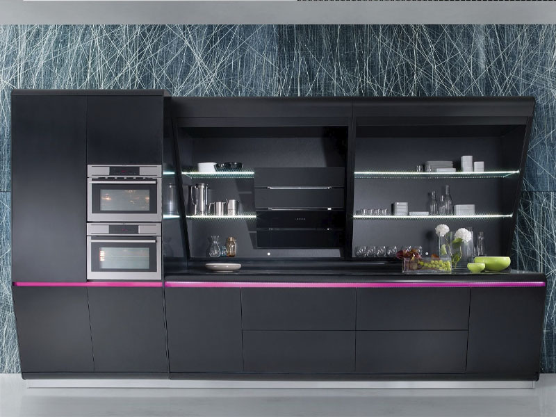 Колонны под холодильник, духовку и кухонный шкаф открываются с помощью выемки. Использование матового или глянцевого стекла для фасадов, а так же керамики позволяет представить модель в еще более эксклюзивном свете, подчеркнув её оригинальность и неповторимость.