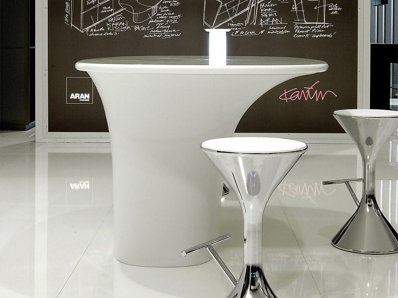 Концепция строится вокруг острова в форме пьедестала. Остров необычной формы приглашает семью и друзей занять свои места вокруг. Как смеситель, так и led-подсветка убираются под гладкую рабочую поверхность. Простое добавление разделочной доски многоцелевого использования над мойкой создаёт устойчивую поверхность, на которой можно накрыть стол. Мягкие изгибы имеют продолжение на блоке у стены. Настенная зеркальная панель также обрамлена led-подсветкой.