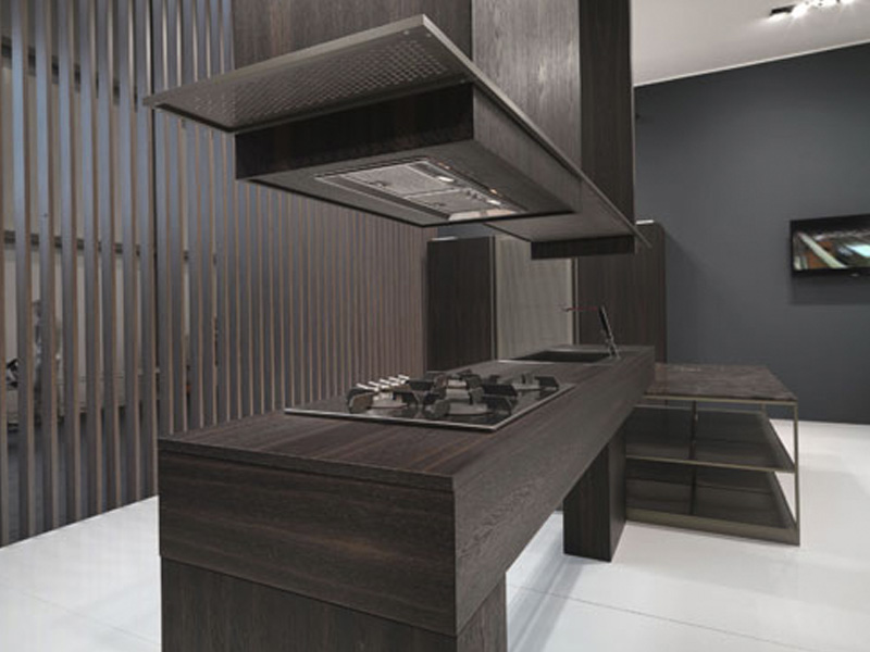 Шкафы спроектированы так, чтобы предоставить максимальный обзор и доступ к содержимому. Жалюзи скрывают стеклянные полки с led-подсветкой и вытяжку над плитой. Используя наклонный шкаф, более объемные предметы можно расположить наверху, а маленькие внизу, и превратить готовку в легкомысленное времяпрепровождение. Нижние модули подчеркнуты цветной led-подсветкой, открываются нажатием и также сделаны наклонными, чтобы обеспечить удобный подход к столешнице. Кроме того, Kook имеет мойку, которую можно спрятать под разделочной доской-люком, что дает возможность получить непрерывную поверхность. Использование фасадов из кориана в алюминевой рамке порождает союз технологии, долговечности и минималисткой эстетики.