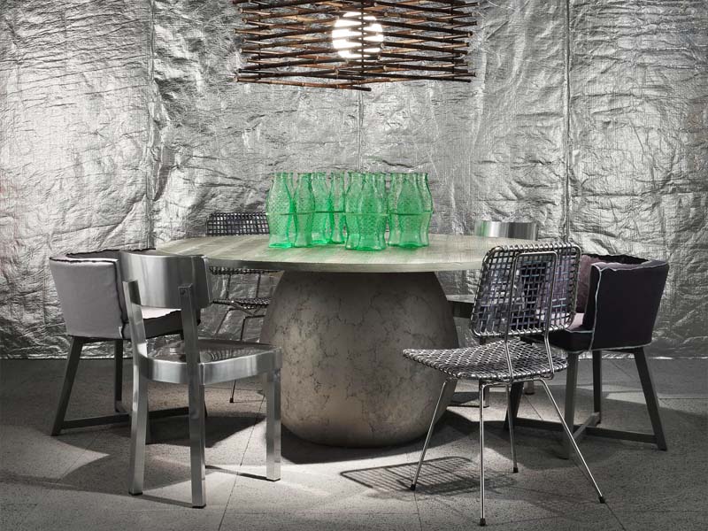 Новинка этого года – столешница Stone Dust из закаленного стекла, которая благодаря инновационной технологии обработки выглядит как натуральный камень толщиной в обычное стекло. Поверхность устойчива к воздействию внешних условий и поэтому идеально подходит для использования на открытом воздухе. Столешницу возможно использовать в столах из различных коллекций Gervasoni.