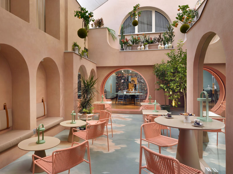 Среди всех залов выделяется расписанный вручную "сад", украшенный предметами Pedrali. Интерьер в пастельных розовых тонах идеально подходит для того, чтобы выпить напиток в жаркие летние дни или устроить кофе-брейк, в буквальном смысле, над облаками. Коллекция Tribeca изготовлена из стали и плетеного шнура, она представляет собой современную интерпретацию классических патио- стульев в стиле 60-ых гг. прошлого века. Стулья гармонично сочетаются с нейтральными тонами столов Ikon (дизайнеры Пио и Тито Тозо), коническое основание которых изготовлено из полипропилена.