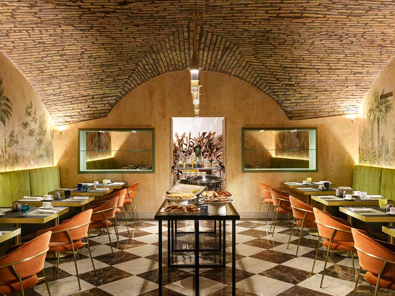 Во время завтрака гости встречаются в зале с красивым сводчатым потолком. Протагонистами этого изысканного интерьера снова является мебель Pedrali: кресла Jazz, сочетающие оранжевый бархат с античной латунной структурой, столы Inox с практичным и функциональным дизайном и мягкая модульная мебель Modus. Последняя здесь представлена в зеленом бархате – в хроматической преемственности с живописной растительной фреской.