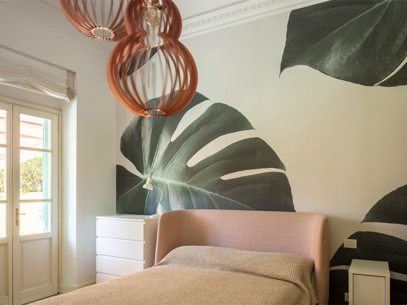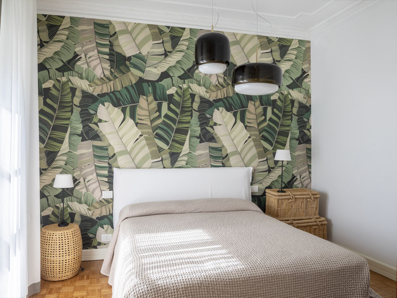 Акцентная стена в главной спальне декорирована обоями с изображением джунглей, которые дополнены бамбуковой мебелью и декором в зеленых тонах. Ванные комнаты выполнены в монохромной гамме. Черная шестиугольная плитка на стенах и полу сочетается со старинной сантехникой в английском стиле.