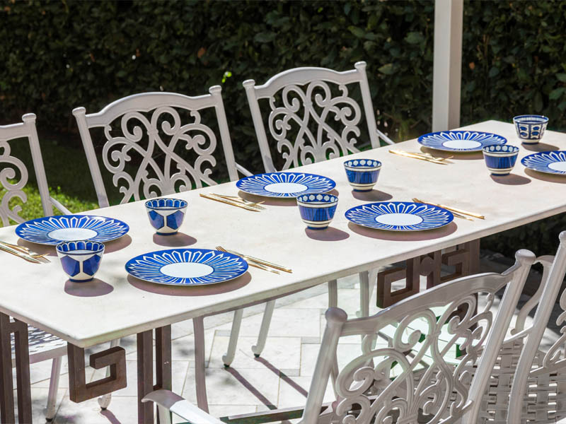 В кухне светло-голубые шкафы сочетаются с латунной фурнитурой, мраморными столешницами и полом, который помогает связать все пространство воедино. Облик интерьера завершает белоснежная штукатурка на стенах и два больших плетеных светильника.