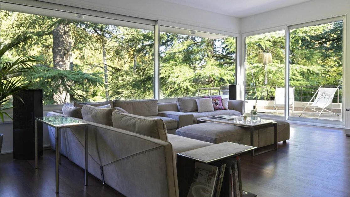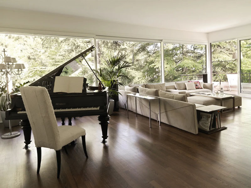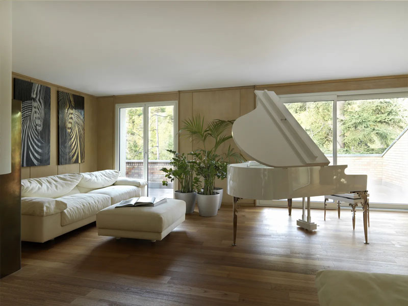 В центре вокруг камина расположилась гостиная, главным героем которой становится модульный диван Visionnaire Bastian. Панорамные окна уподобляют пространство привилегированной природной обсерватории. Сидя на диване, можно погрузиться в созерцание леса, который словно обнимает зрителя. В соседней музыкальной зоне установлен рояль. Всего в резиденции два инструмента; по словам хозяина, каждое мгновение его дня проходит в такт мелодии.