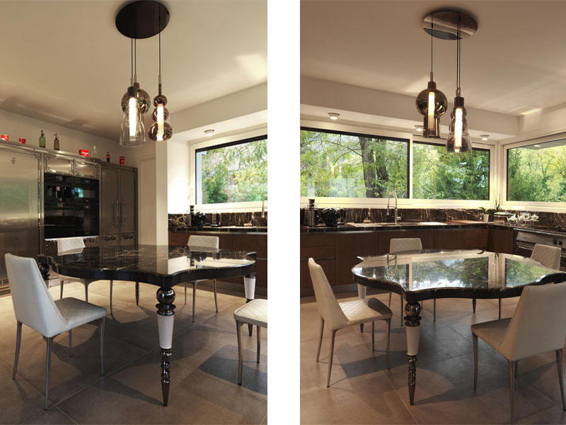 Для столовой зоны выбран бестселлер Visionnaire – стол Versailles, выпущенный в 2008 г. по дизайну Алессандро Ла Спада. Модель отличается усеченными коническими ножками и мраморной столешницей Port Saint Laurent.