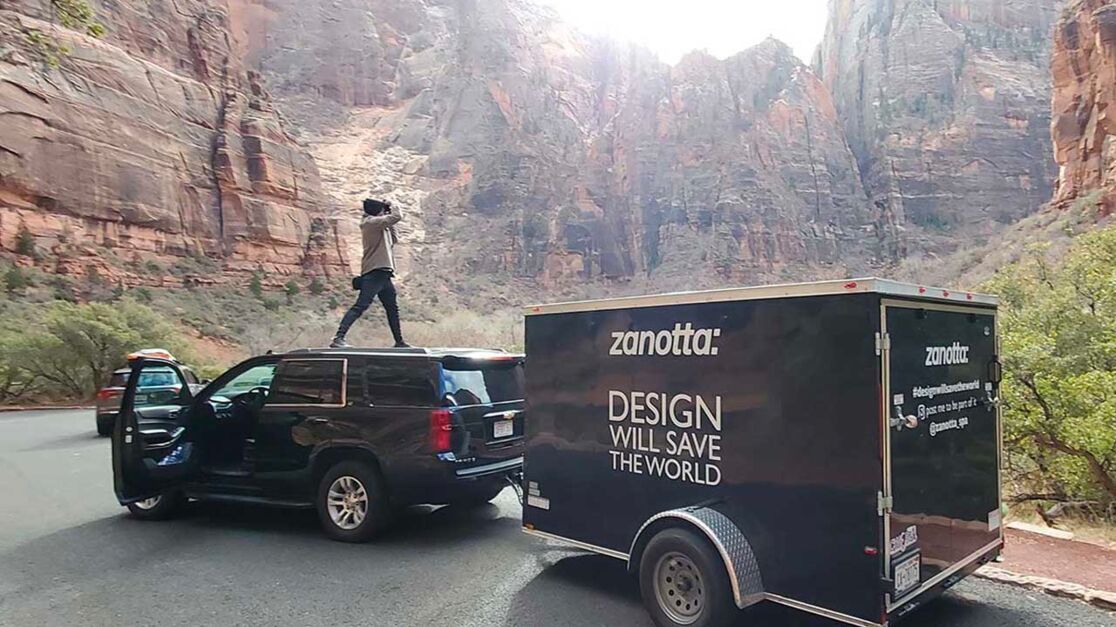 Тур рождается из культуры бренда. По словам самого Франческо, основная задача проекта – вернуть в центр дизайна его истинных героев – людей. Так, он загружает тележку бестселлерами и новинками бренда и выезжает из Манхэттена, чтобы приблизиться к партнерам, дилерам, архитектурным фирмам и др. Проехав 24 тысячи миль, Франческо обнаружил места, о существовании которых даже не знал. Кроме того, было интересно запечатлеть интерьерные хиты Zanotta на фоне культовых локаций. Итальянская мебель буквально побывала "на гастролях", окунувшись в волшебные природные контексты, вступив в диалог с каньонами, пустыней, лесами, большими национальными парками или “сценографиями” из западных фильмов. От Гранд-Каньона до Долины монументов и замерзшего озера Мичиган, где культовое кресло-мешок Zanotta пылает на горизонте молчаливого Чикаго огненно-алым пятном…