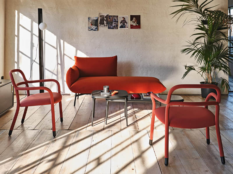 Коллекция характеризуется мягкими линиями и очевидным отсутствием несущей конструкции. Тонкая металлическая структура в основании создает резкий визуальный контраст с объемными подушками. Последние подчеркивают легкость коллекции настолько, что каждый элемент кажется свободно парящим в воздухе. Плавные изгибы, мягкие обволакивающие формы, непринужденная простота дизайна – все это делает сиденья уютными и гостеприимными, подходящими как для контрактного, так и жилого сектора. Area – динамичное решение на полпути между рабочим местом и зоной отдыха.
