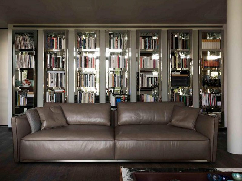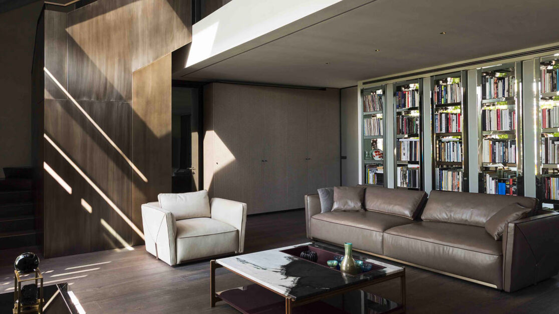 Архитектурным центром просторной двухуровневой гостиной является несущая стена, оснащенная модулями книжного шкафа в зеркальной отделке Speyer – культового предмета коллекции фабрики. Он сочетается с декоративными световыми элементами и внушительных размеров лестницей, искусно скрывающей обувной стеллаж и кладовку.