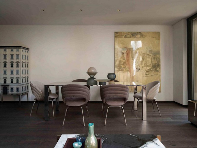 Интерьер гостиной включает коллекцию мягкой мебели Bastian (диз. Мауро Липпарини) – светло-коричневый диван с декоративной окантовкой шоколадного цвета, а также кресло из бархатистой кожи; низкий столик Kings Cross из массива ореха Canaletto с подчеркнуто открытыми порами и столешницей из далматинского мрамора; обеденный стол Kudrun со стальным основанием, мягкие стулья Kylo светло-коричневого и табачного цвета (диз. Алессандро Ла Спада), а также низкий шкаф Gareth со стальным основанием и столешницей из тонированного черного стекла. Дополняют интерьер хрустальная ваза Equilibri Visionnaire (дуэт Занеллато и Бортолотто), ваза "Ballet" из муранского стекла (худ. Марта Джардини), а также настенная работа эмалью по дереву от Эммануэль Барчилон.
