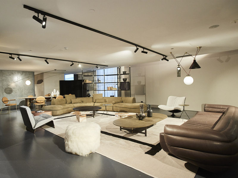 Первое, что видят посетители на входе в салон, – диван Chester Moon, один из самых знаковых продуктов бренда. В спальной зоне демонстрируются предметы из новой коллекции, такие как кровать Stone, кресло Leon и ковер Himani C, а также кресло Nepal Mama, стул Lazybones и письменный стол Parsec. Уникальное сочетание материалов, характерное для Baxter, особенно поражает в гостиной, где клиент находит еще два хита фабрики: диваны Piaf и Tactile, а также кресла Greta SE Printed и Marilyn, пуф Anais, столы Placè, Фивы и Liquid и ковер Atlas. В обеденных зонах кожа стульев Gemma и Gemma сочетается с изумительными камнями столешниц Lagos и Selene. Дополняют пространство книжный шкаф Libelle и витрина Float.