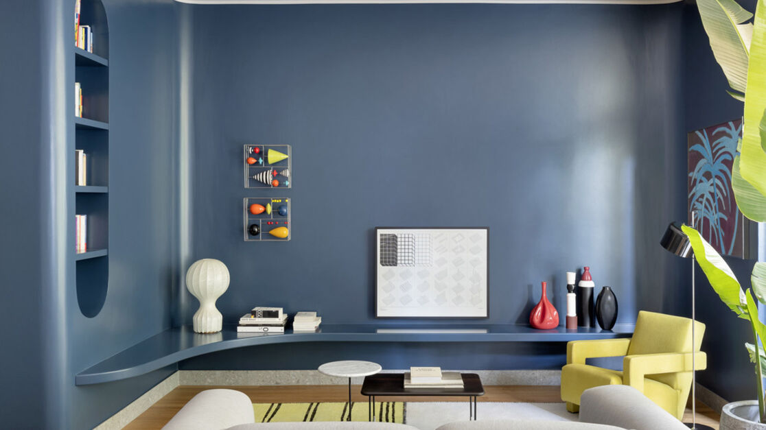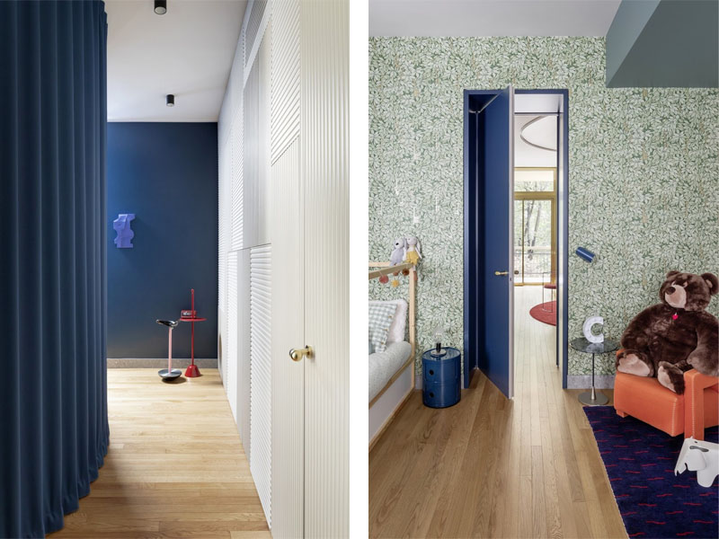 Рельефные панели – не просто декор стен. Это дверцы встроенного шкафа и входная дверь в детскую. Здесь находим табурет Sella по дизайну Акилле и Пьера Джакомо Кастильони (1957 г.) и столик Servomuto по дизайну Акилле Кастильони (1974 г.), все – Zanotta. Рядом – стилизованная прикроватная тумбочка Componibili от Kartell.