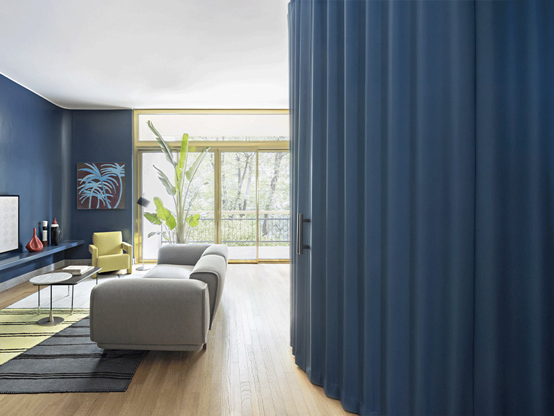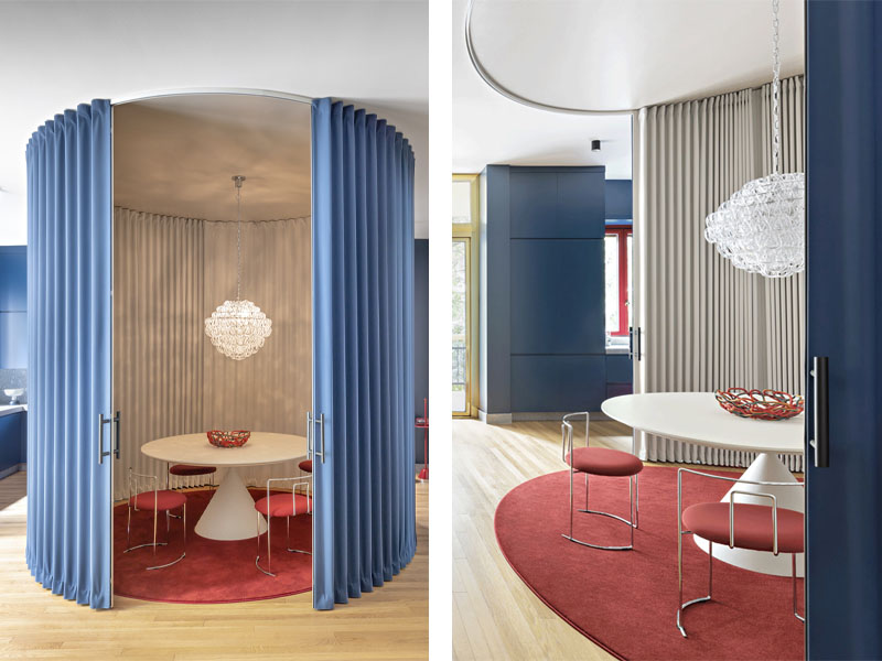 По центру гостиной – необычная каркасная система с раздвижным занавесом. За тканевой перегородкой скрыта тайная комната – столовая. Здесь главный герой – стол Clay от итальянской фабрики Desalto. Модель выпущена по дизайну Марка Крузина и представляет собой оригинальную геометрическую скульптуру, где объединены красота и точные пропорции. Конусовидное основание сужается кверху и острым концом прочно удерживает круглую по форме столешницу. Предмет впервые представлен на iSaloni в 2015 г. и за годы своего существования стал настоящей классикой современности.