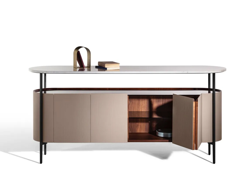 Сервант и витрина из коллекции Pinnacle разработан для итальянского бренда Turri дизайнером Хуан Цюань. В то же время это причудливая витрина, где можно выставлять коллекционные предметы. Боковые панели обтянуты кожей.