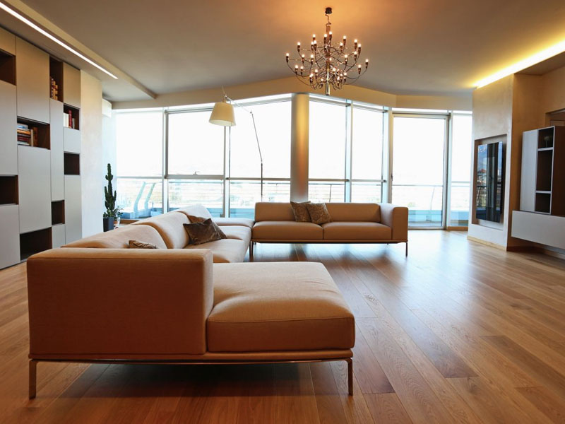 Отраженный свет освещает по периметру потолок, белые стены и паркет из натурального дуба. А в помощь натуральному освещению – культовые приборы: потолочный светильник 2097 от Flos и такой узнаваемый торшер Artemide Tolomeo Mega.
