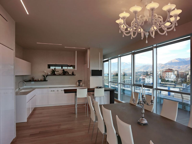 Жилье Анны и Марко расположено на последнем этаже здания, который прежде использовался для офисов. Сейчас же преобразованное пространство идеально подходит для своих хозяев, дает фантастический вид на горные вершины и представляет собой настоящий open space. Вот почему для архитекторов и дизайнеров проекта одну из ключевых задач представлял выбор кухни, которая должна обеспечить все условия для встреч с многочисленными друзьями, но одновременно – не «ломать» пространство и не заграждать вид. Открытый и светлый кухонный гарнитур в белом лаке, дополненный большим столом на 12 персон – удачное решение, чтобы реализовать поставленную цель. Органично подобраны и барные стулья Lio в белой коже от итальянской фабрики Zanotta.