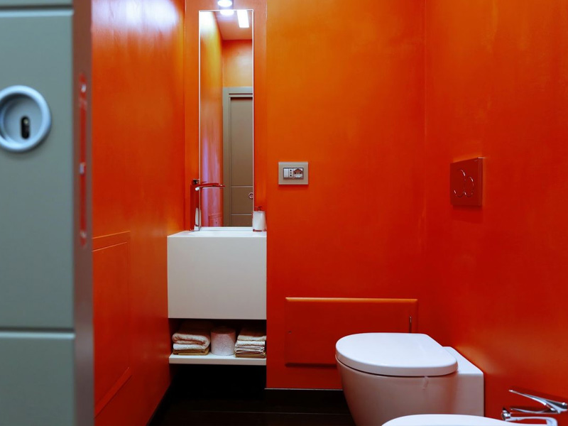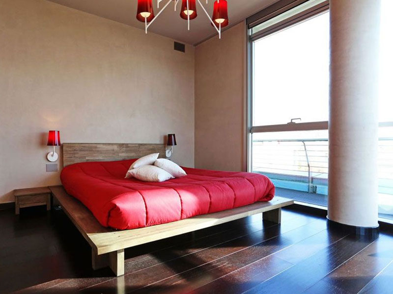 В целом стиль можно охарактеризовать как элегантный и одновременно функциональный. Только яркие штрихи ломают классическую схему «белый + дерево»; огненный красный находим в спальне молодой пары и ванной комнате для гостей. Невероятно стильно смотрится и контрастный рояль на фоне яркой стены.