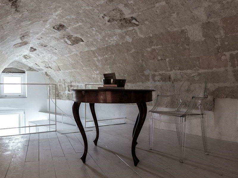 Пространство с крошечным балконом используется в качестве гостиной. Мебель контрастна и проста: возможно, Вы узнали стулья от итальянской фабрики Kartell. С помощью всего лишь намека на цвет и чистые силуэты Lomo создает невесомый эффект и акцентирует внимание на античных элементах.