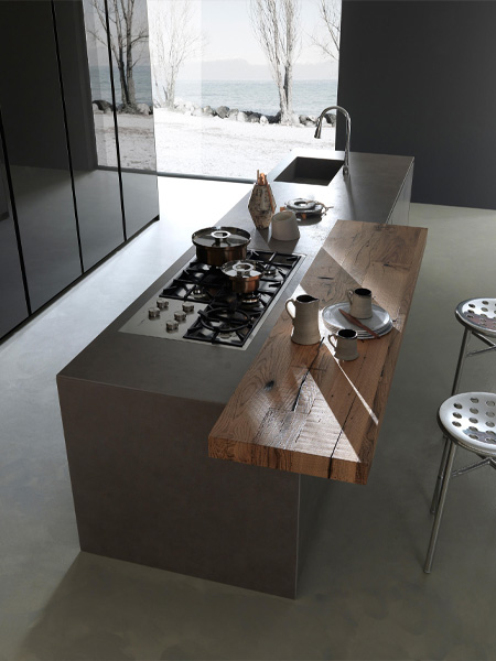 Традиции и инновации сливаются воедино в этой неординарной модели. Основание, боковые панели и топ выполнены в инновационном материале керлит, в то время как барная стойка толщиной 8 см – состаренный массив дуба.