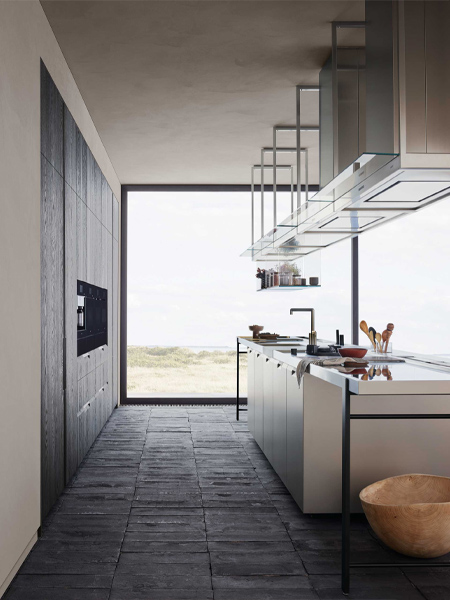 Продуманные аксессуары упрощают быт кулинаров. Среди них – инновационная «парящая» рабочая поверхность на ножках Minus или новая система вытяжек Infinity со встроенной системой освещения, которая дополнена стеклянными подвесными модулями-полками.