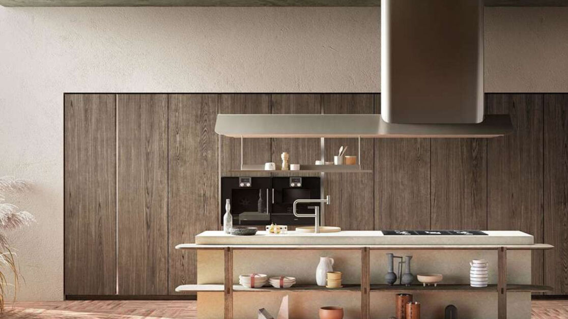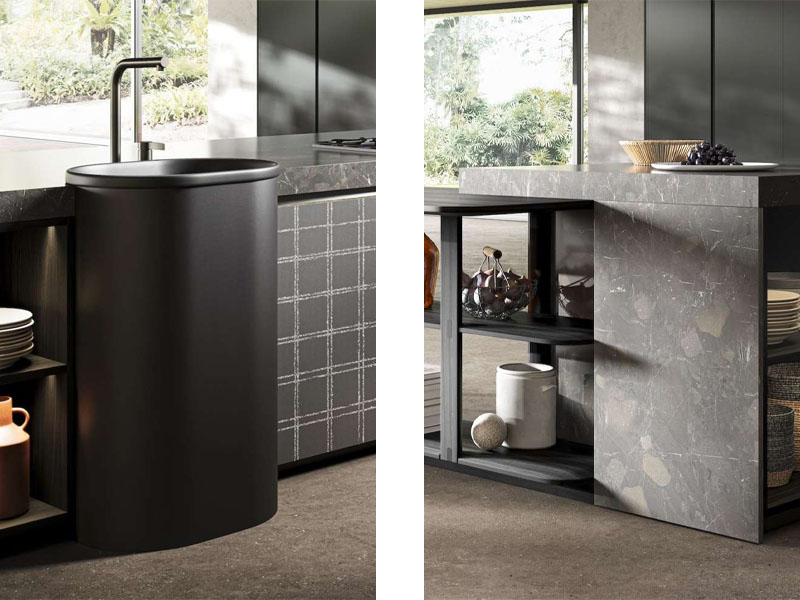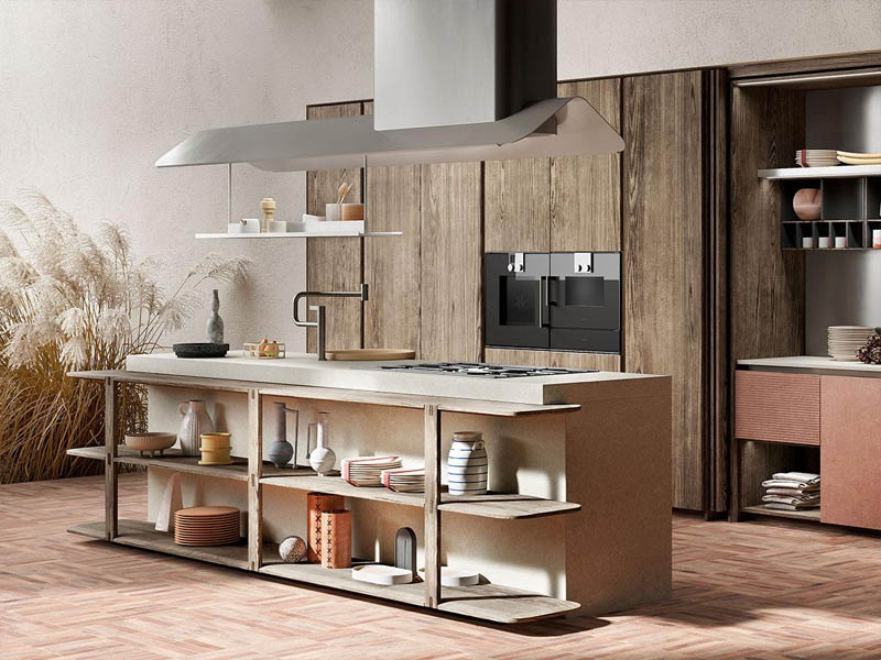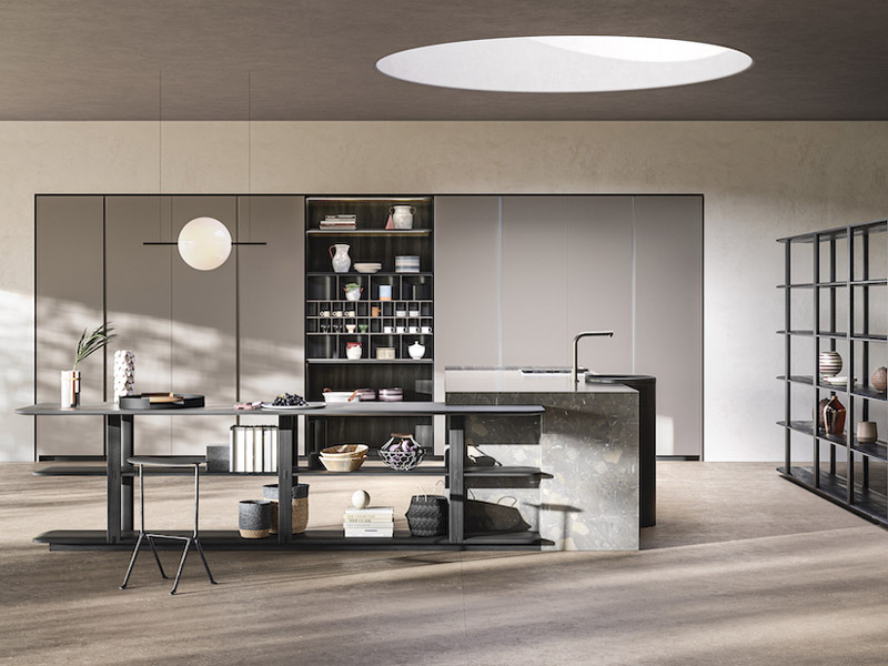 Разъединенные элементы и обширные открытые пространства для хранения позволяют создать кухню, которая выходит далеко за рамки модульной структуры и позволяет неформальные композиции, характерные для итальянских кухонь прошлого столетия.