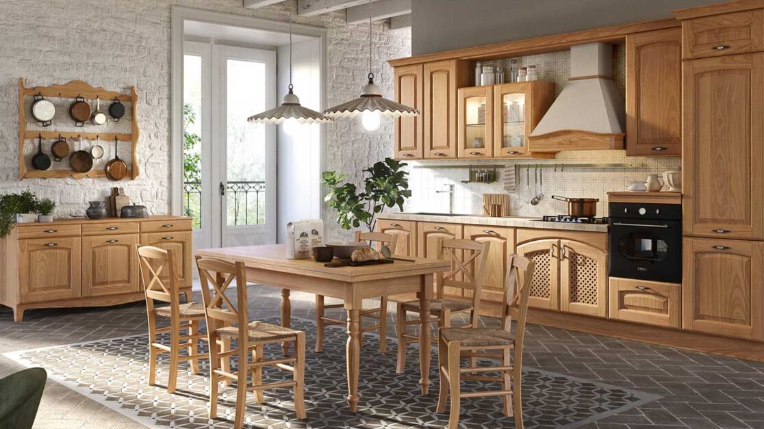 На первый план выходит красота натурального дерева: на всех фасадах шкафчиков и полок видна яркая природная фактура, которая никогда не выйдет из моды. Дверцы украшены филенками и декоративными решетками.