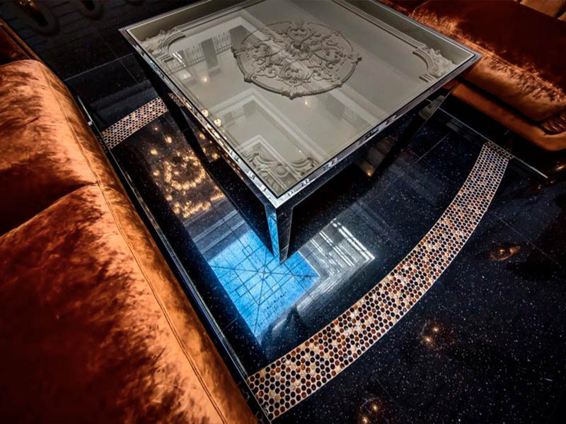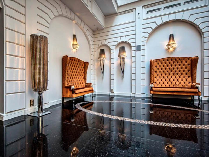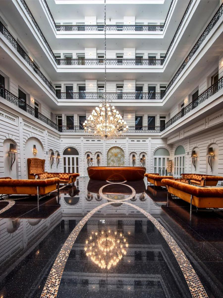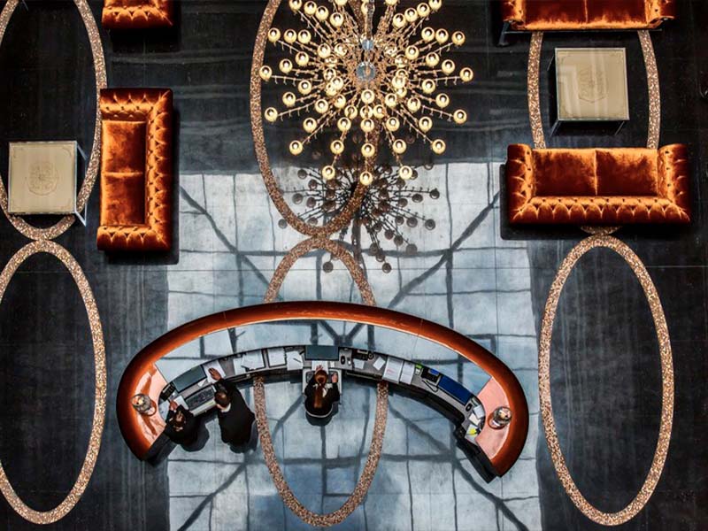 Автор проекта – архитектор Vörös Virág – спроектировал лобби до мельчайших деталей, учитывая специфику и историю здания, а также потребности постоянных клиентов. Для меблировки выбраны интерьерные новинки премиум-класса от итальянского бренда Visionnaire. Роскошные диваны Chester Dudley спроектированы эксклюзивно для Visionnaire дизайнерским дуэтом Роберто Тапиназзи и Маурицио Манцони. Они обиты бархатом медного цвета с металлическим отливом и сгруппированы по два. Благодаря замкнутой форме предметы создают в зале отеля полуприватные зоны, которые идеально подходят для деловых бесед или дружеских встреч. Диваны идеально гармонируют с объемной медной стойкой регистрации. Глянцевый пол холодного темного оттенка эффектно контрастирует с Chester Dudley, а расположенные в арках по периметру зала бра подсвечивают мягкую мебель, расставляя акценты в интерьере отеля.