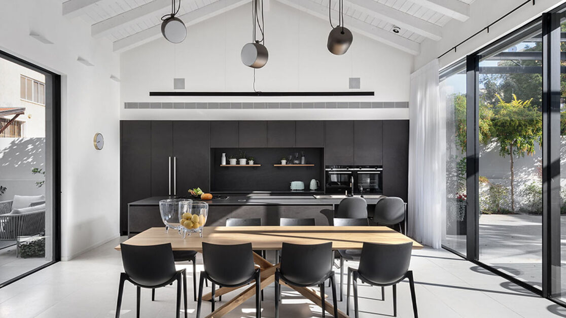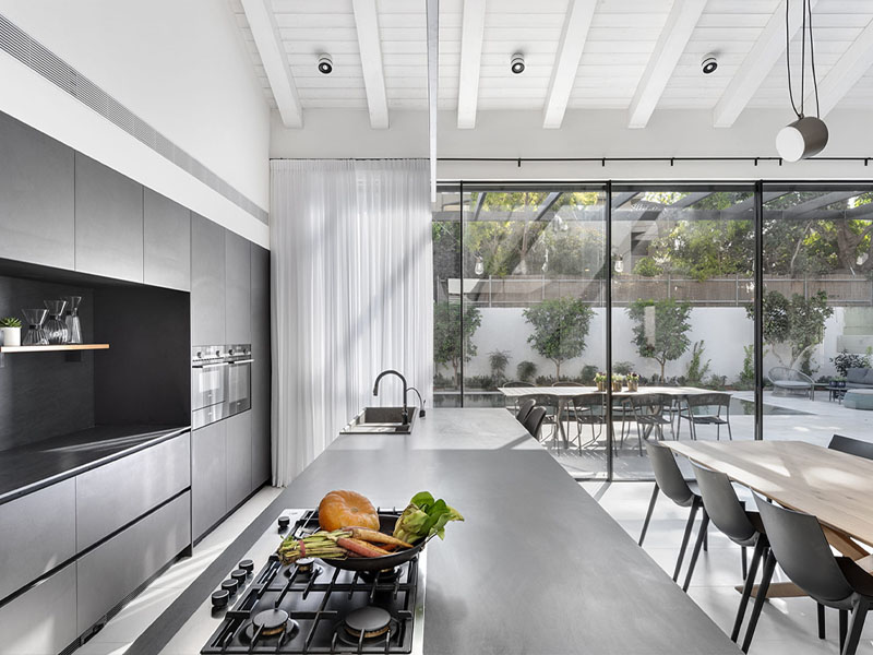 Один заказчик обратился к дизайнеру интерьеров Нурит Геффен с нестандартной просьбой. Он желал дом, где все пространство было бы организовано вокруг кухни. Проект должен был учитывать потребности семьи с тремя детьми, где мать имеет инвалидность, ограничивающую ее подвижность. В то же время глава семейства мечтал о стильном и просторном интерьере, не имеющем ничего общего с домом престарелых.
