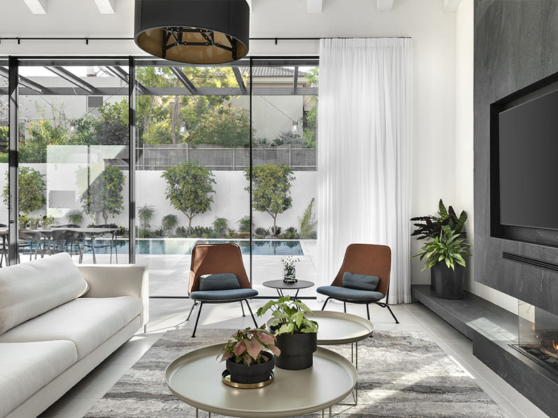 На первом этаже дома архитектор обустроила открытую и светлую комнату площадью 80 м. кв., в которой разместились кухня, столовая и гостиная зоны. Строгая и практичная кухня спроектирована итальянской фабрикой Modulnova на основе модели MH6, отделка Caltec Lava D98. Столешница и скинали – в цвете Basalt Black (Neolith). Графитовый оттенок гарнитура контрастирует с белизной стен и в то же время сближает кухню с гостиной, делая ее более похожей на жилую зону. Фактически первый этаж спроектирован как студия, где жена может оставаться подолгу, не будучи отрезанной от других членов семьи. «Было необходимо, чтобы в этом помещении у нее была кухня и вид на остальную часть этажа – патио и сад с бассейном», – комментирует архитектор.