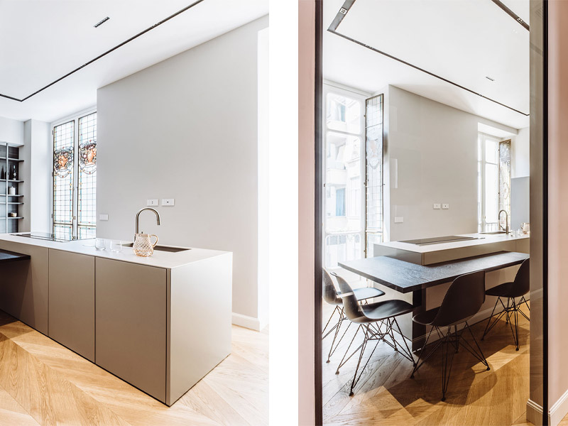 До реставрации апартаменты являлись примером классической планировки с центральным коридором и последовательностью расположенных вдоль него комнат. «У новых владельцев было желание сделать жилье более функциональным, ярким и, по крайней мере, с тремя спальнями и одной студией,» - объясняет архитектор Маттео Италия. Таким образом, проект реконструкции решительно изменил внутреннюю планировку, определяющую расположение несущих стен и структурные ограничения.