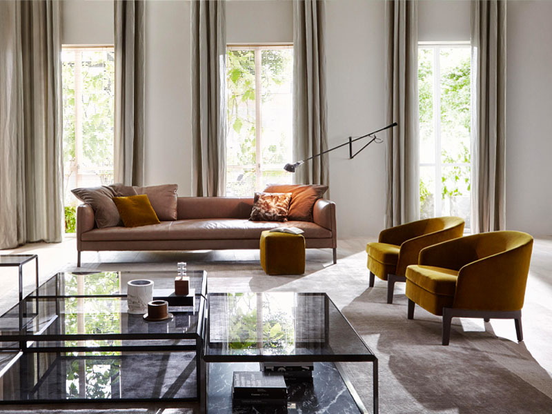 1. Диван Molteni&C Paul с невысокой прямой спинкой и прямыми подлокотниками на одном уровне со спинкой. Прямые ножки, на которых приподнята модель, придают изделию легкости и изящности, а лаконичный силуэт идеально сочетается со строгостью современного интерьера. Размер 275х120 см.
