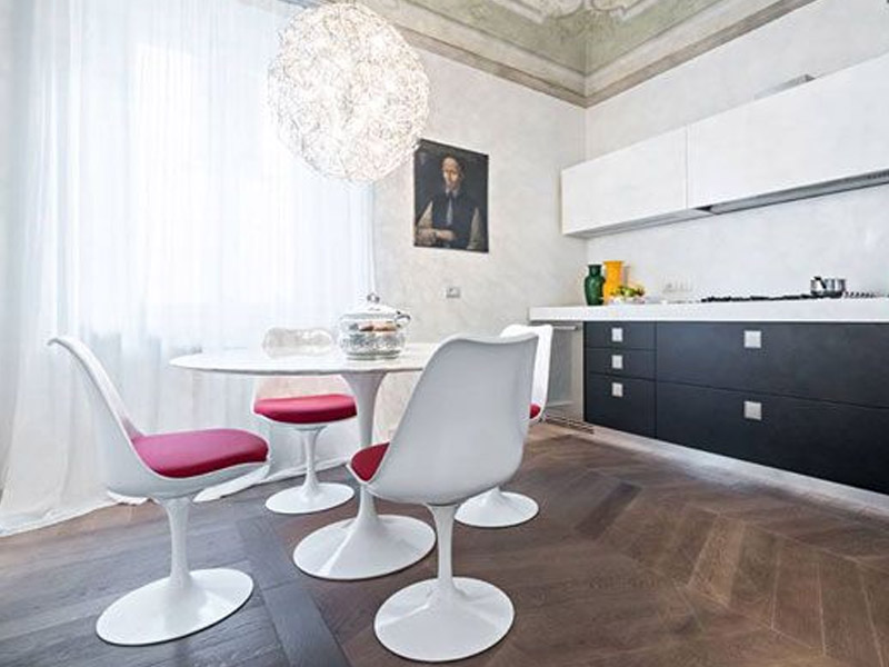 Безусловно, Вы легко обнаружите культовые предметы интерьера в этом неординарном проекте. Это, в первую очередь, стул 606 Barrel di Frank Lloyd Wright в домашнем кабинете: модель производится с 1937 года и до настоящих дней итальянской фабрикой Cassina. А также неизменный атрибут многих современных интерьеров – торшер Arco, предложенный дизайнерским союзом Achille e Pier Giacomo Castiglioni для итальянского бренда Flos еще в 1962 году и с тех пор неизменно пользующийся широким интересом и любовью. И конечно, гнутые венские стулья Thonet – в частности, модель 209, успешно выпускаемую с 1900 года.