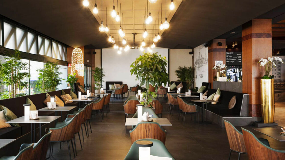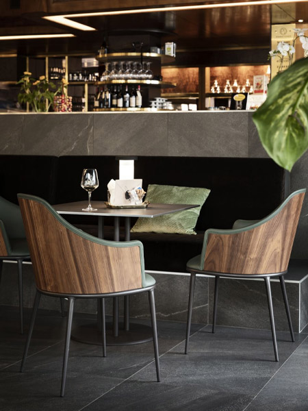 Большие внутренние залы освещены свисающими с потолка лампочками и обставлены креслами из коллекции Lea. Сиденья выполнены в сочетании отделок: искусственная кожа соснового цвета и дерево. Они отлично гармонируют с яркой обстановкой, характеризующейся высокими потолками и большими окнами.